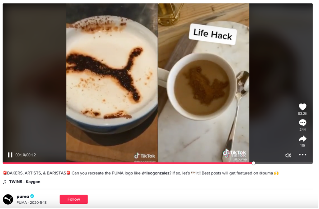 Každá značka sa musí hýbať s dobou, a preto je nevyhnutné zaradiť krátke videá do komunikácie na sociálnych sieťach. Krátke videá vedia byť originálne a vytvoríte ich rýchlo. Skvelým príkladom je aj virálne video, v ktorom sa fanúšik snažil otlačiť logo Puma na svoju kávu. Žiaľ neúspešne.. alebo, že by aj úspešne? Jeho video neskôr zdieľala samotná značka na svojom profile.